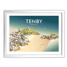 A stunning design of Tenby Art Print. By talented artist, Dave Thompson. Thompson's art revisits a classic era of poster design, taking many elements of popular 1950's travel art, while remaining current and vibrant.