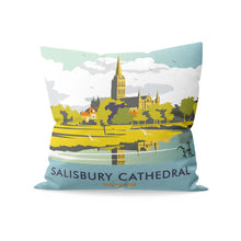 Stylish cushion design of Salisbury Cathedral, Wiltshire by talented artist, Dave Thompson. Thompson's art revisits a classic era of poster design, taking many elements of popular 1950's travel art, while remaining current and vibrant. Measuring in at 40cm x 40cm, our comfortable cushions come filled with plump microfibre inner for a lasting shape. Proudly printed and produced on Soft-touch faux suede in the UK.